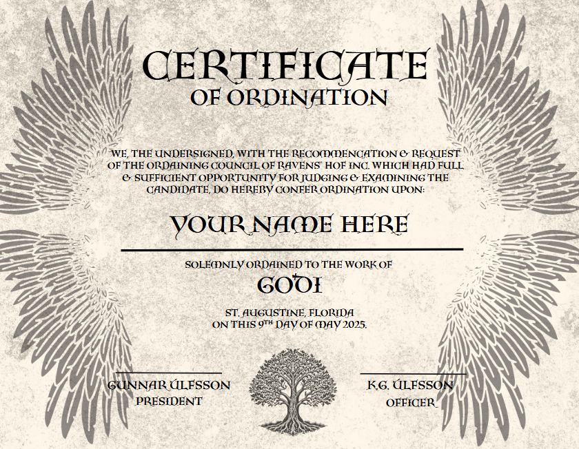 Ravens’ Hof extends the opportunity of ordination simply because we need more heathen clergy to service our people. Note: Our ordinations are not “online” ordinations but rather distance ordinations. We have a screening process in place and, as well, send out via USPS Priority Mail, a beautiful, formal, signed by real humans, and sealed certificate of ordination once ordained.